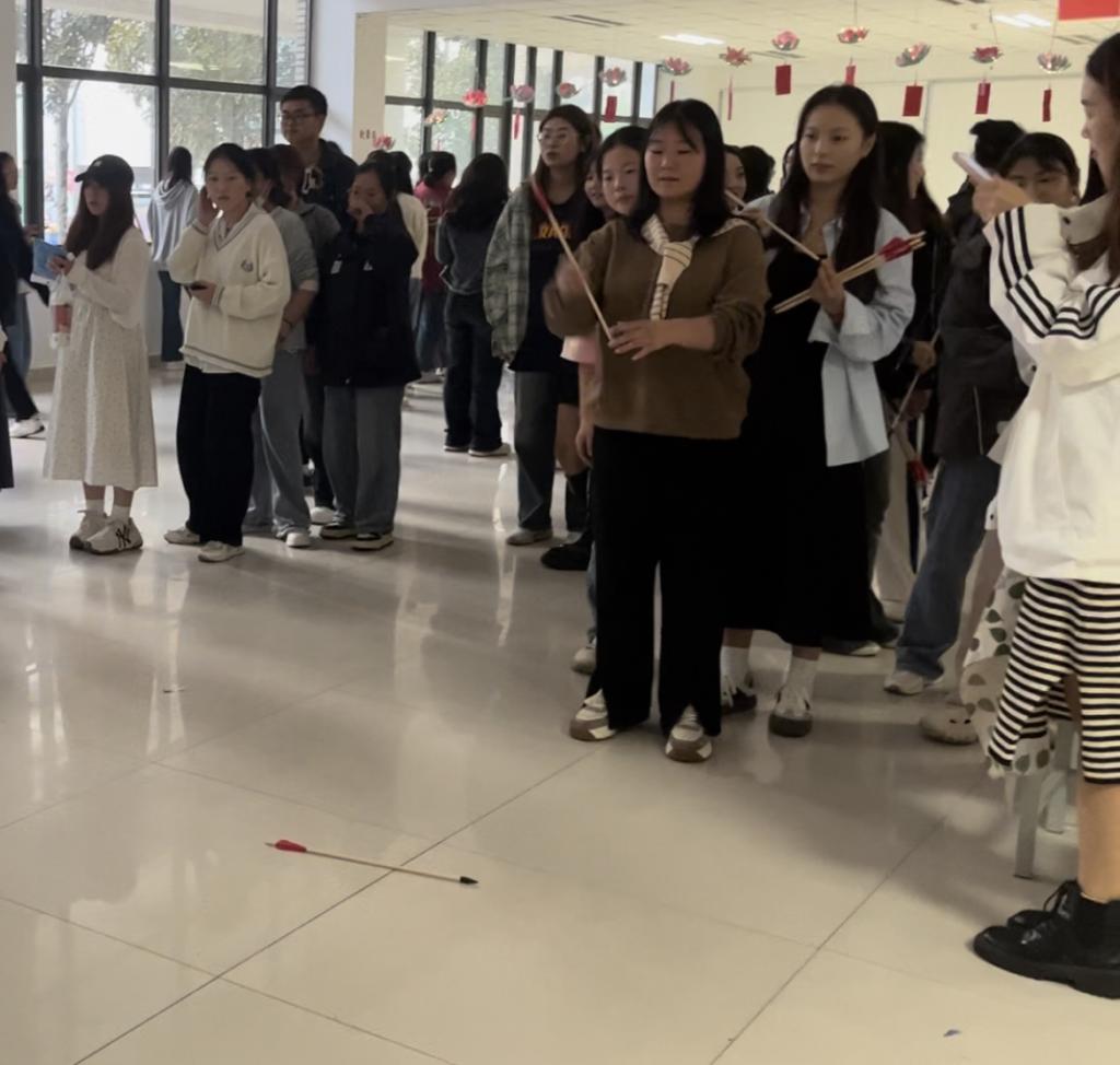 现场设计了许多主题活动,分为赏月区、抚琴区、投壶区、说书区、射箭区、宫饼区、吃茶区、猜谜区、对诗区、赏灯区等多个区域,同学们在不同的区域可以感受到多种多样的习俗和文化。活动开始后,同学们积极有序地参与到各个活动中,感受猜灯谜时的奇思妙想,投壶射箭时的凝神静气,飞花令时的妙语连珠。与此同时,听书区的同学们,也在认真专注的听说书人讲吃茶、宫饼的由来,现场热闹又有序。同学们在感受节日带来的欢乐的同时,浓浓的传统文化学习氛围伴随着灵动的灯光也荡漾在整个校园。