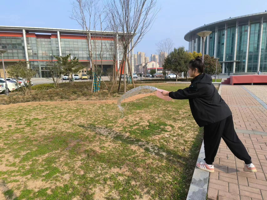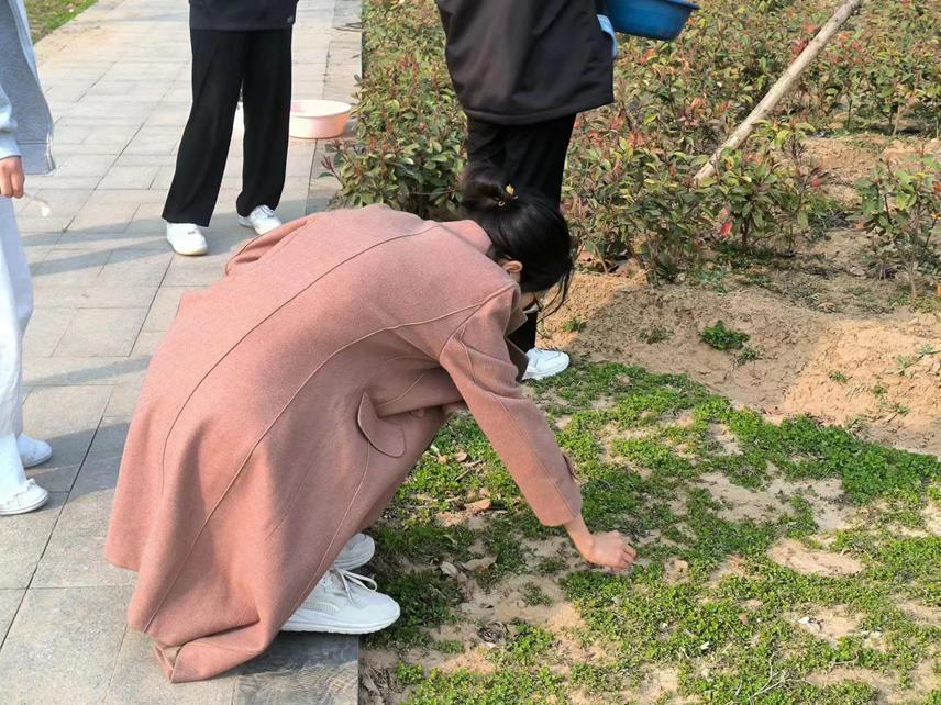 活动现场热火朝天,同学们分组进行捡垃圾、落叶,养护绿化、浇水的活动,同学们手持垃圾袋、水桶,进行浇水育苗,齐心协力,让幼苗重焕生机,校园里呈现出和谐、生机勃勃的景象。参加活动的同学们热情洋溢,干劲十足,欢声笑语在校园中回荡。