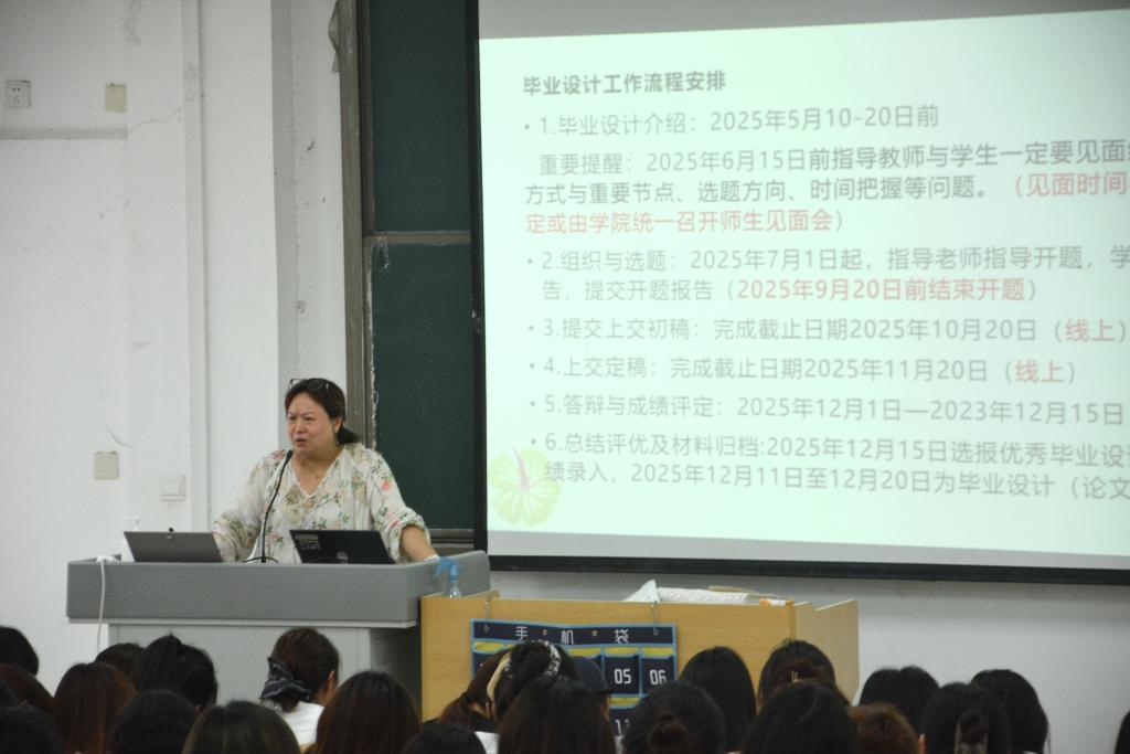 李娜介绍了毕业设计全流程,强调其作为理论与实践结合的关键环节,要求员工立足专业、注重创新,严谨完成各阶段任务。