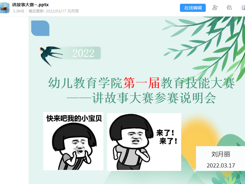 比赛分为初赛和决赛两个环节。初赛由选手自选故事录制视频参赛,决赛为现场比赛。同学们于3月8日~12日积极报名后,在3月17日,刘月丽老师为拟报名员工开展了线上讲故事大赛参赛说明会,阐明了赛事的意义和参赛要求。