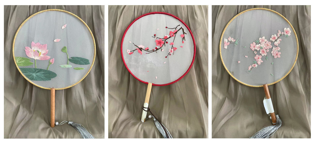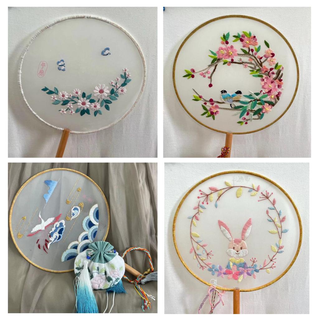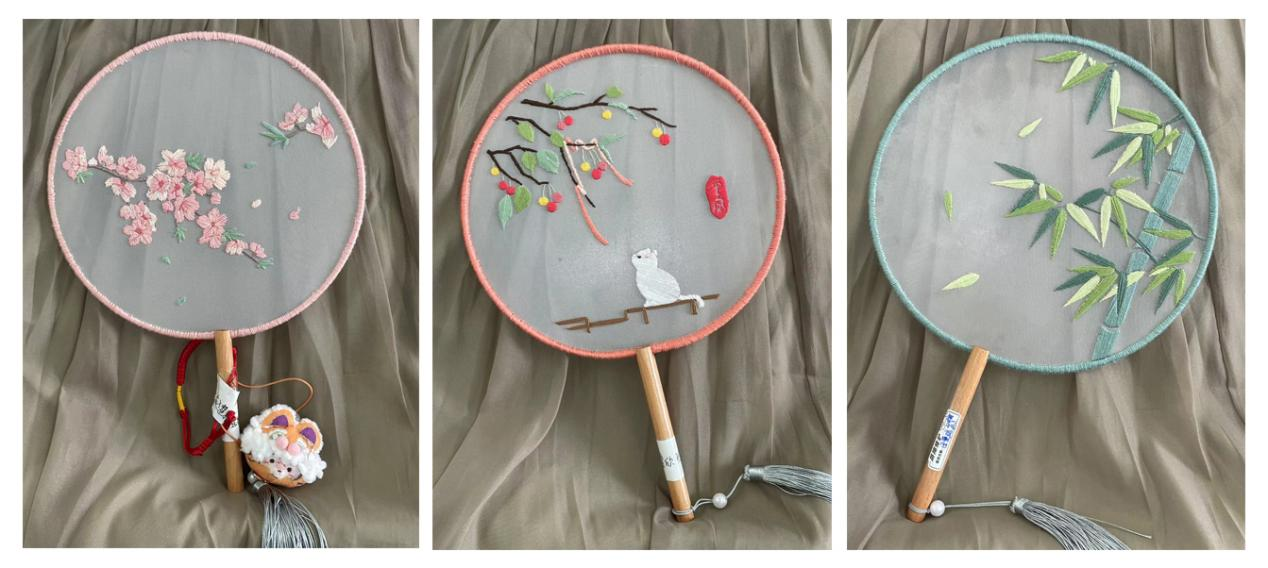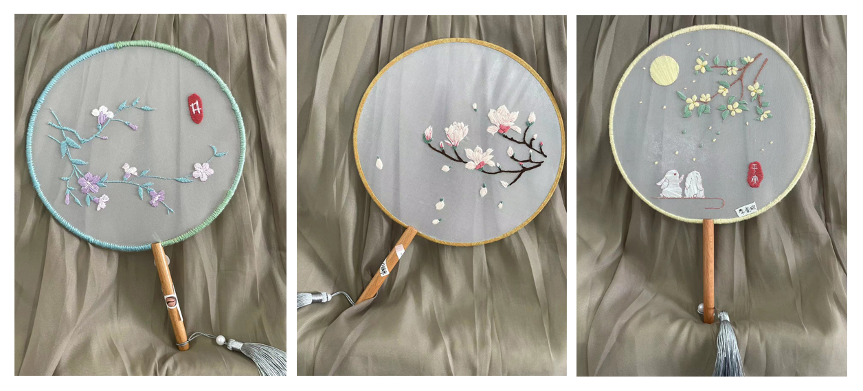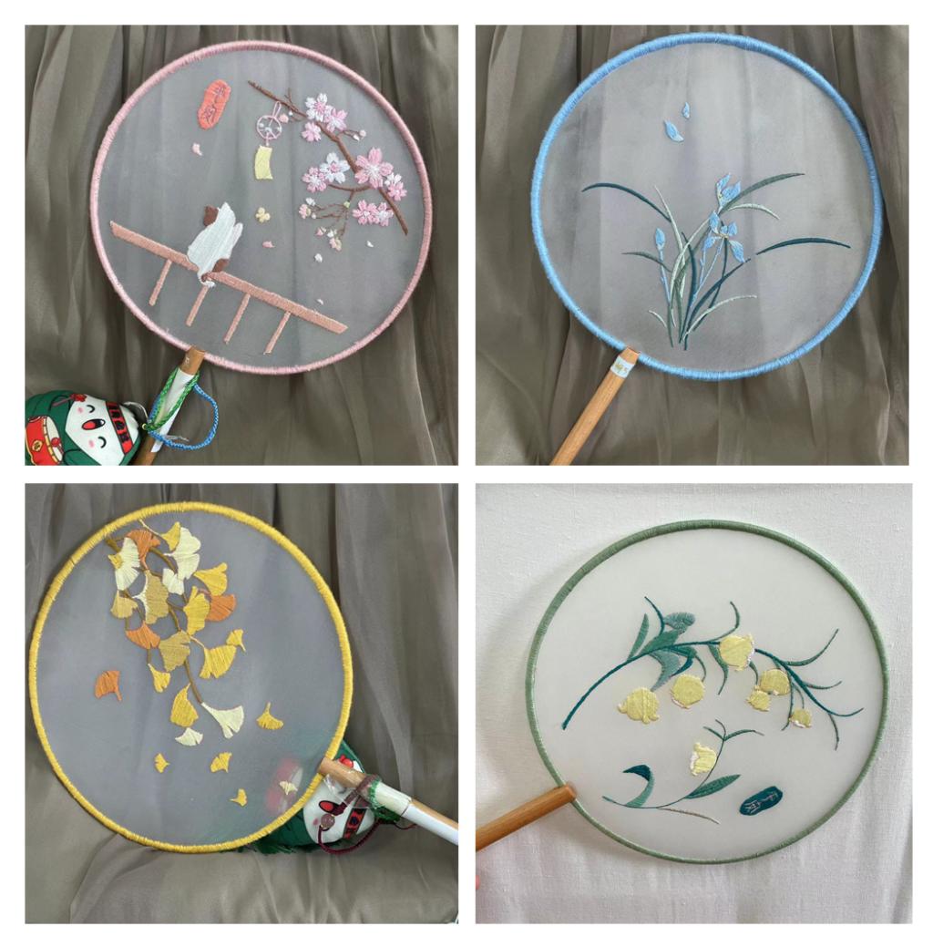 团扇起源于中国,又称宫扇、纨扇,是中国汉族传统工艺品及艺术品,是一种圆形有柄的扇子,它代表着团圆友善、吉祥如意。同学们在绣制扇面的过程中,更增加了对传统文化的喜爱。